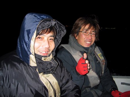 左:行きの様子。凪とは言え寒いんよ。 右:記念撮影です。(マーベリック号のHPより)