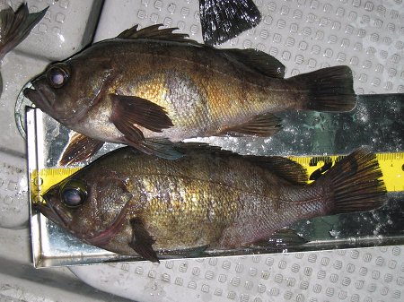 左:プロゲットのポン級のアイナメ。 右:メバルのサイズ(23.5cm)でーす。