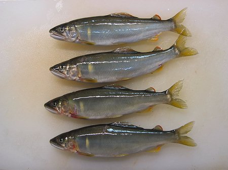 塩焼きで食べた4匹。一番下の鮎には背掛かりの傷が付いています。