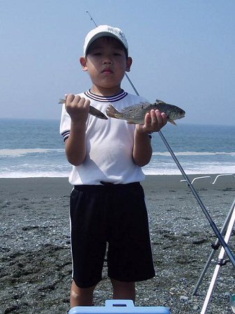 左:待望の一匹目。サイズが小さいのでゴミが掛かったような感じ。 右:こましな90cm。