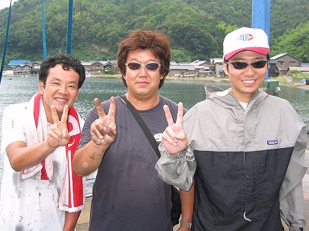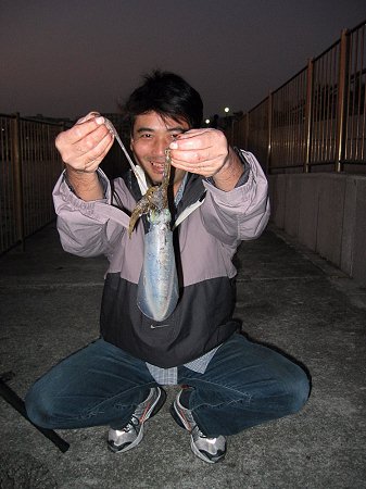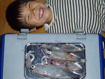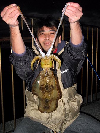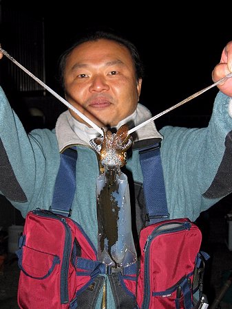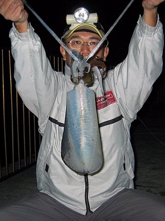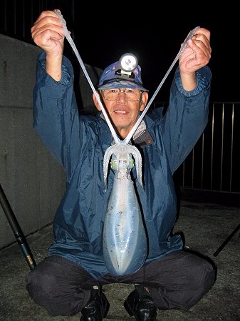 この日一番の大物を生き餌でゲットした親父さん。�`級の大型アオリイカ。