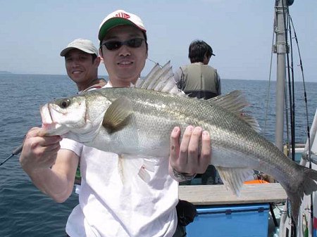 左:田中氏のゲットしたスズキ。 右:佐合君のゲットしたサゴシ(鰆の一歩手前)