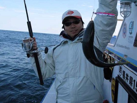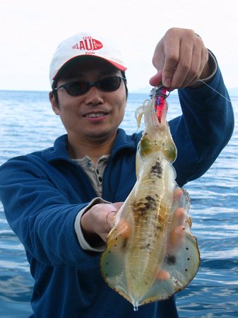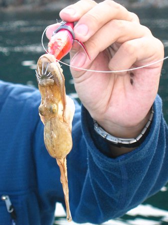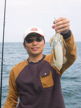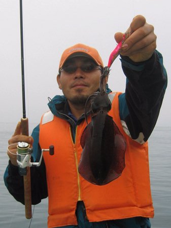 遊漁船に乗っかってマイカを釣り上げる田中氏。