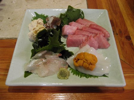 右:刺身の盛り合わせ(生湯葉・明石たこ・まぐろ・鯛の昆布〆・烏賊・生うに・ワカメ)